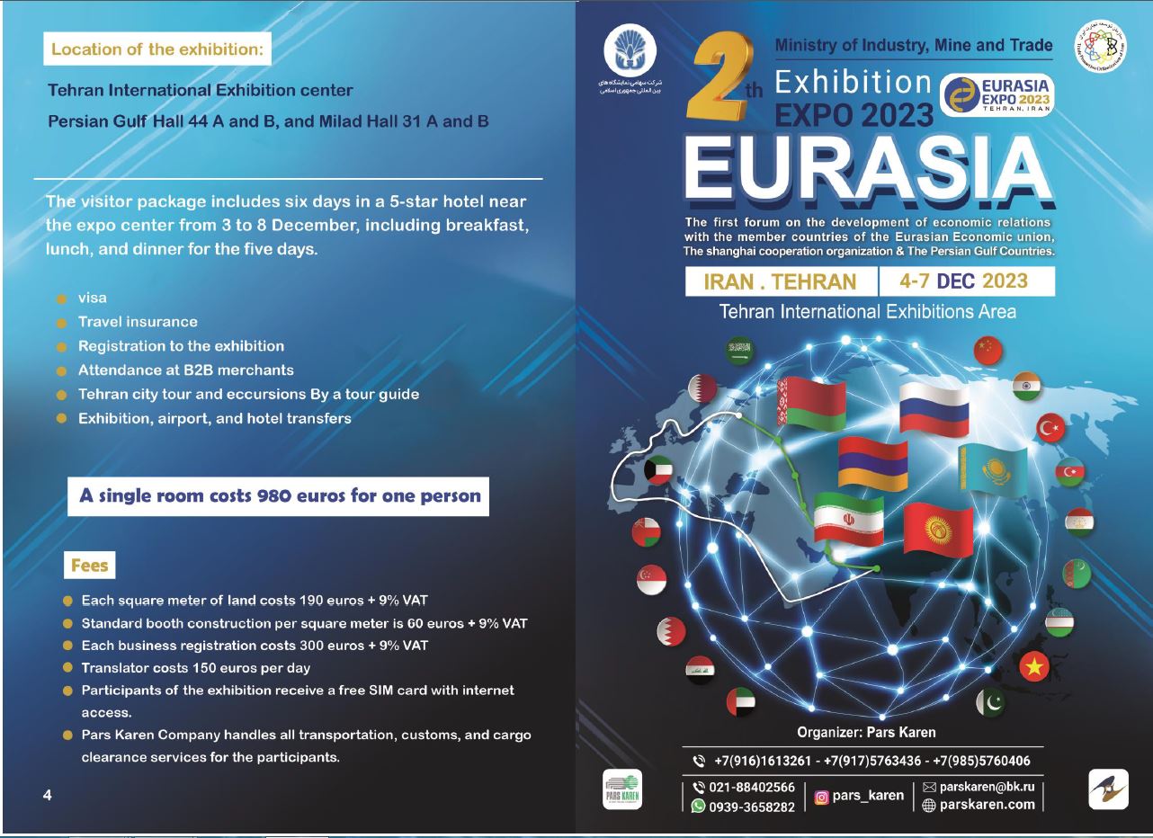 نمایشگاه اختصاصی اوراسیا از تاریخ ۱۳ تا ۱۶ آذرماه 1402 با حضور مقامات کشورهای عضو اتحادیه اوراسیا و برخی از کشورهای عضو شانگهای و شورای همکاری خلیج فارس در محل دائمی نمایشگاه بینالمللی تهران برگزار خواهد شد.